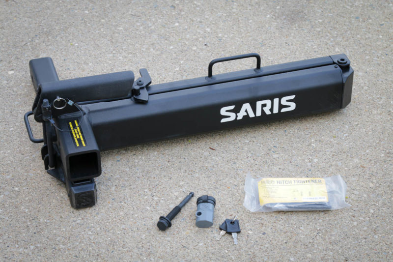 While the position of the rack in the adapter is well-nigh the same as the Kuat, the Saris Swing Abroad adapter itself sticks out farther from the vehicle'south hitch. Measuring from the hitch face to the end of the adapter, the Saris measures 14″ while the Kuat measures 11.v″. this positions the rack nigh 2.5″ farther from the vehicle.